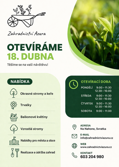 24.04.2026 Nové zahradnictví ve Svratce, otevřeno od 18. dubna 2026, viz. informační leták v příloze Informační leták _Zahradnictví Azura - Svratka (229.76 Kb)